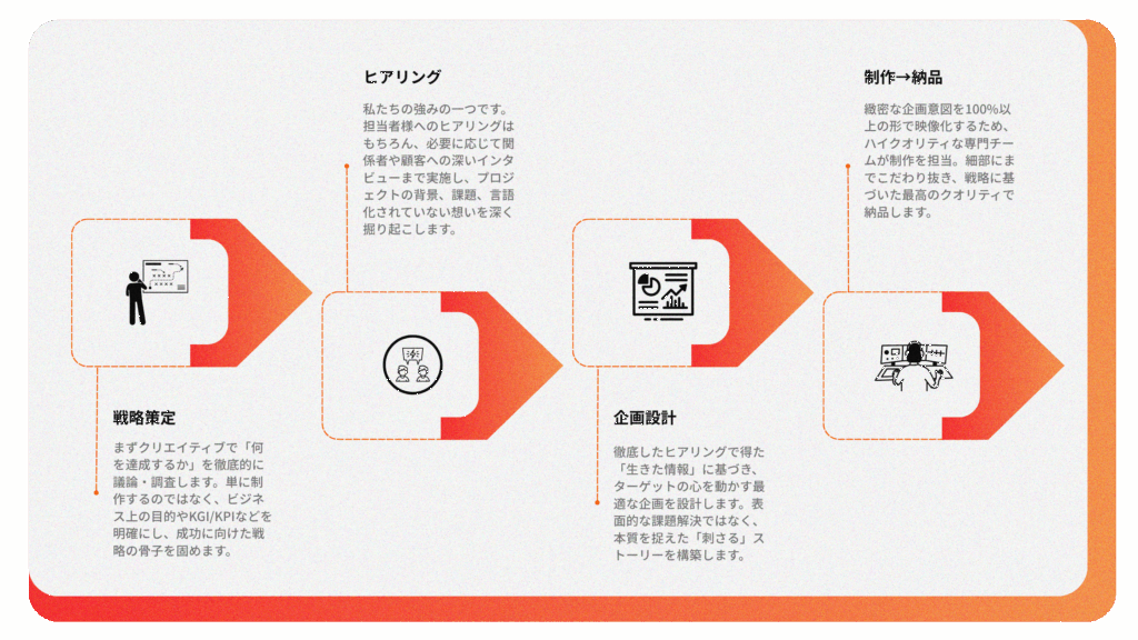 GILGIL STUDIOは映像制作や写真撮影といったクリエイティブの枠を越え、顕在化していない経営課題ごと解決するソリューションです。