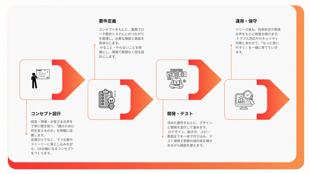 肩の力を抜いて話し合ううちにシステムが形作られていくDX体験を、ぜひ事業成長の一翼にしてください。